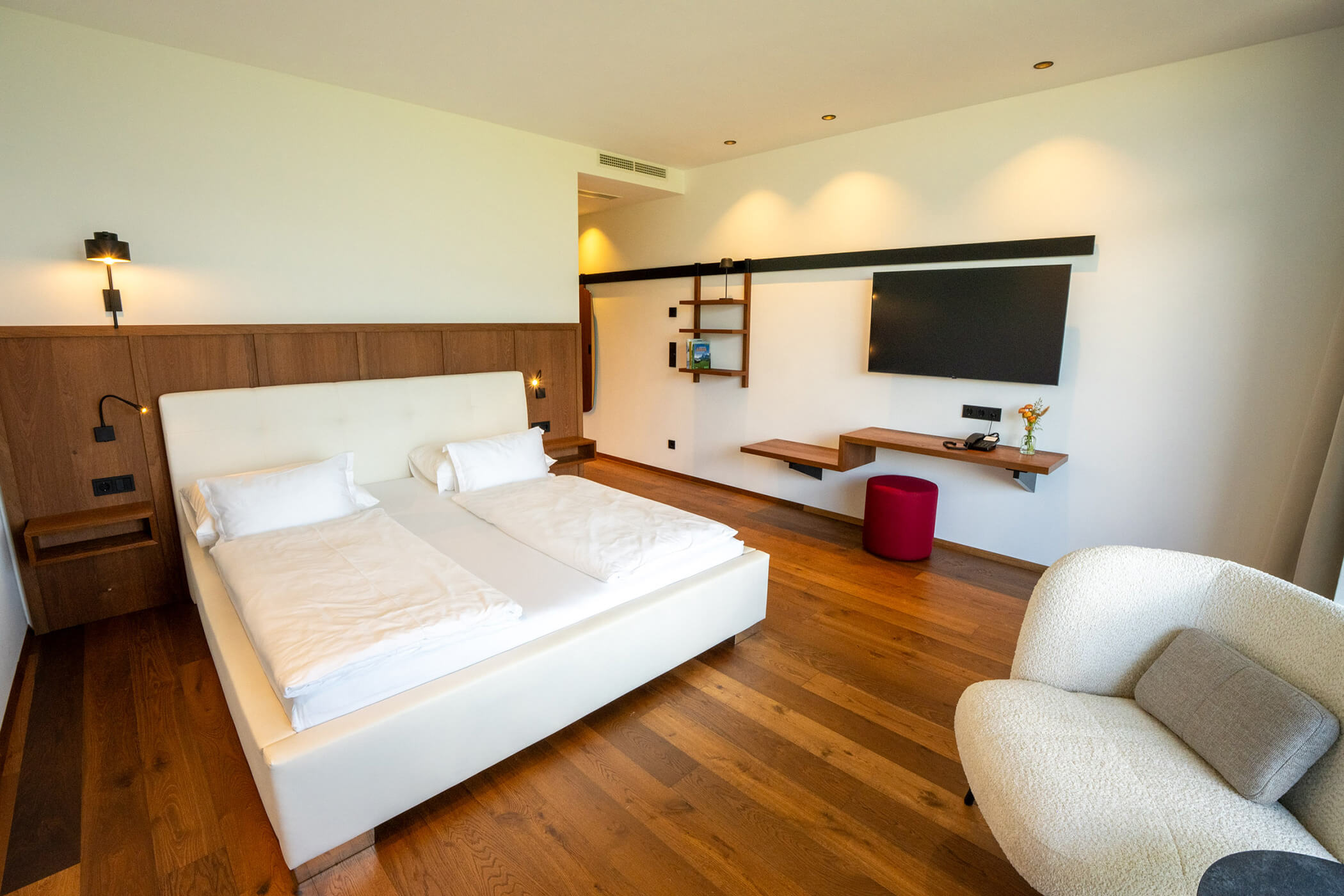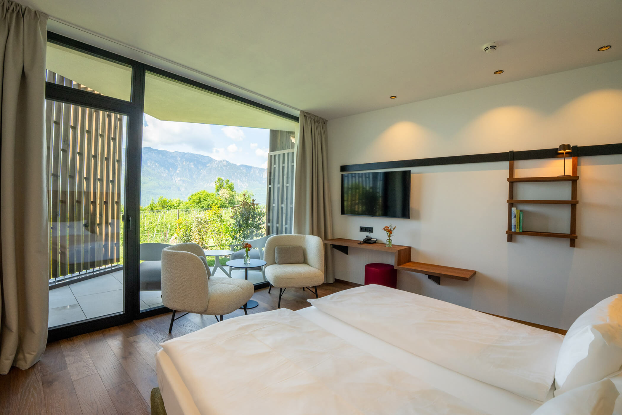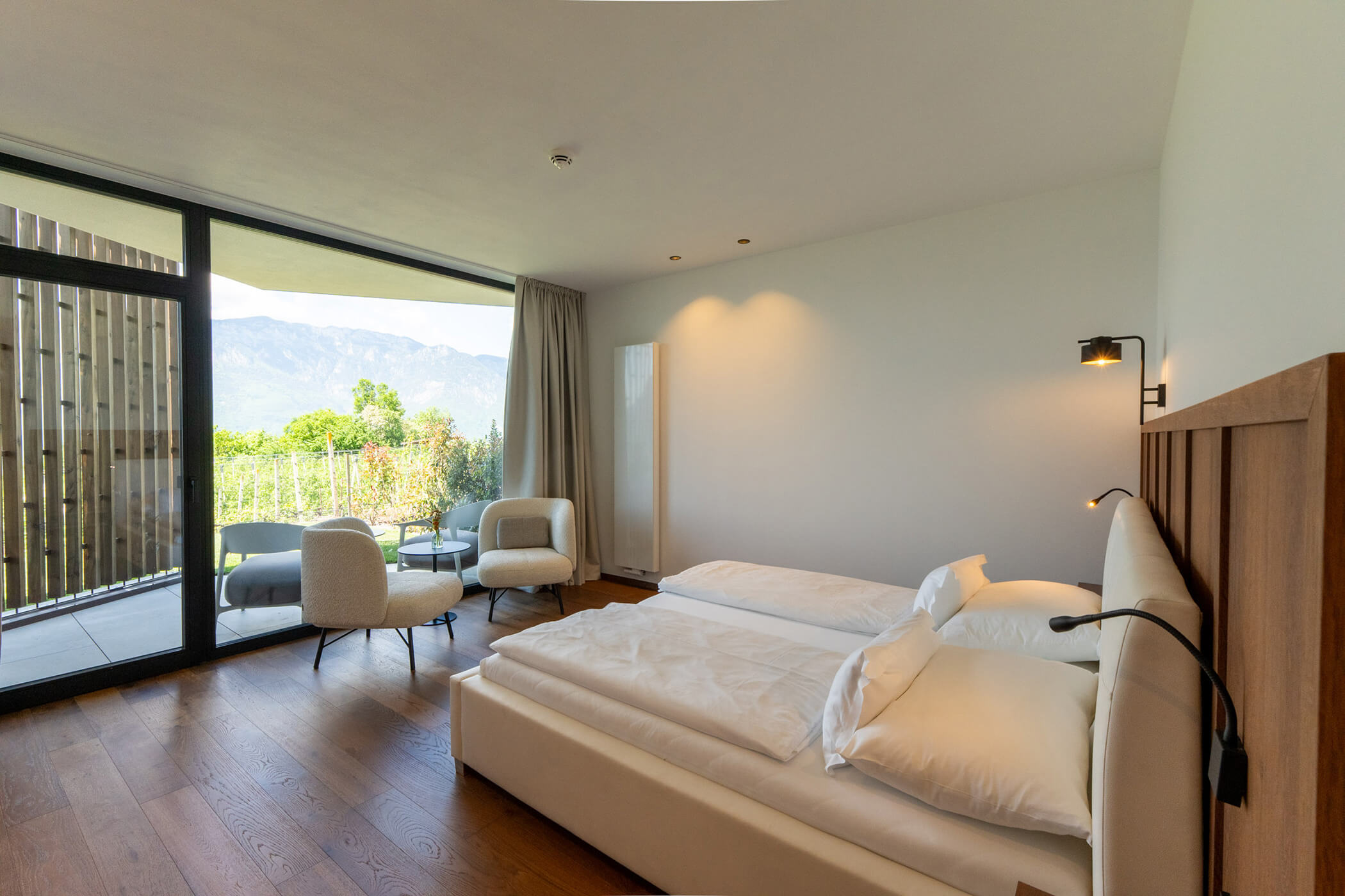 Neu ab Mai 2025: Die Gartenzimmer Weinberg im Erdgeschoss bieten modernen Komfort inmitten der Natur. Mit direktem Blick auf die Weinberge und einem eigenen Gartenbereich vor dem Balkon genießen Sie Ruhe und Freiraum – perfekt für entspannte Stunden im Grünen.